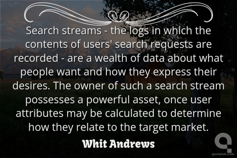 Search streams - the logs in which the contents of users' search requests are recorded - are a wealth of data about what people want and how they express their desires. The owner of such a search stream possesses a powerful asset, once user attributes may be calculated to determine how they relate to the target market. Whit Andrews