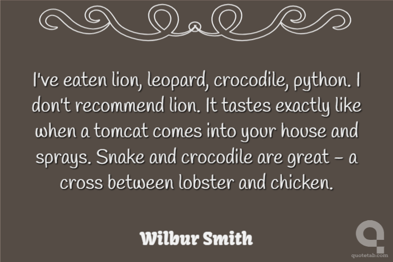 I've eaten lion, leopard, crocodile, python. I don't recommend lion. It tastes exactly like when a tomcat comes into your house and sprays. Snake and crocodile are great - a cross between lobster and chicken. Wilbur Smith