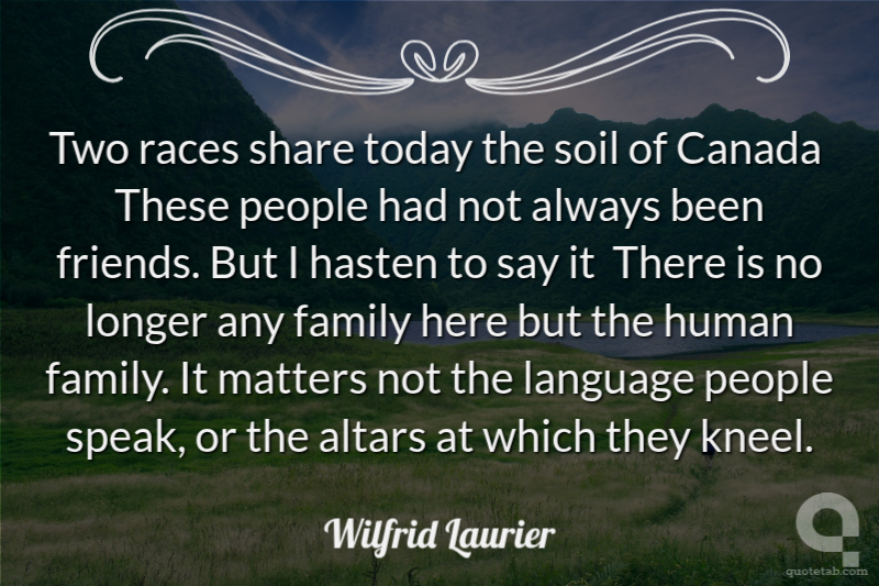 Two races share today the soil of Canada These people had not always been friends. But I hasten to say it There is no longer any family here but the human family. It matters not the language people speak, or the altars at which they kneel. Wilfrid Laurier