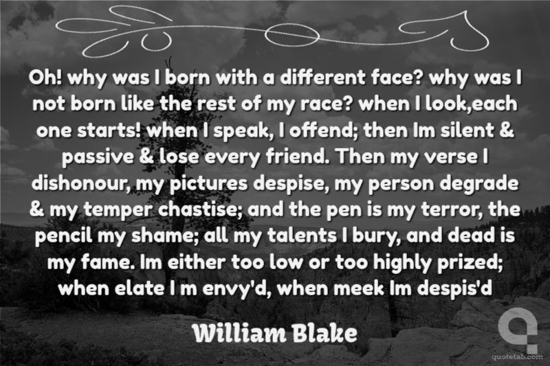 Oh! why was I born with a different face? why was I not born like the rest of my race? when I look,each one starts! when I speak, I offend; then Im silent & passive & lose every friend. Then my verse I dishonour, my pictures despise, my person degrade & my temper chastise; and the pen is my terror, the pencil my shame; all my talents I bury, and dead is my fame. Im either too low or too highly prized; when elate I m envy'd, when meek Im despis'd William Blake