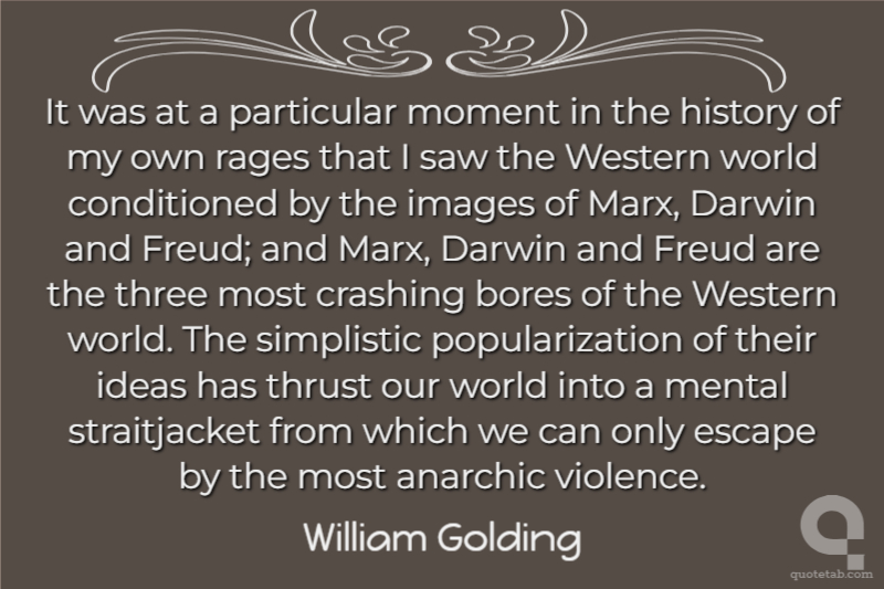 It was at a particular moment in the history of my own rages that I saw the Western world conditioned by the images of Marx, Darwin and Freud; and Marx, Darwin and Freud are the three most crashing bores of the Western world. The simplistic popularization of their ideas has thrust our world into a mental straitjacket from which we can only escape by the most anarchic violence. William Golding