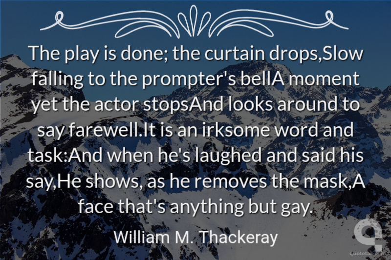 The play is done; the curtain drops,Slow falling to the prompter's bellA moment yet the actor stopsAnd looks around to say farewell.It is an irksome word and task:And when he's laughed and said his say,He shows, as he removes the mask,A face that's anything but gay. William M. Thackeray