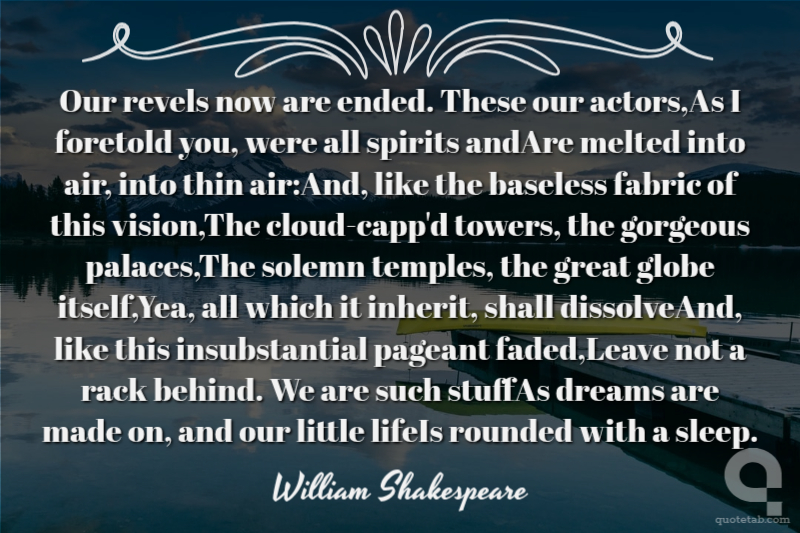 Our revels now are ended. These our actors,As I foretold you, were all spirits andAre melted into air, into thin air:And, like the baseless fabric of this vision,The cloud-capp'd towers, the gorgeous palaces,The solemn temples, the great globe itself,Yea, all which it inherit, shall dissolveAnd, like this insubstantial pageant faded,Leave not a rack behind. We are such stuffAs dreams are made on, and our little lifeIs rounded with a sleep. William Shakespeare