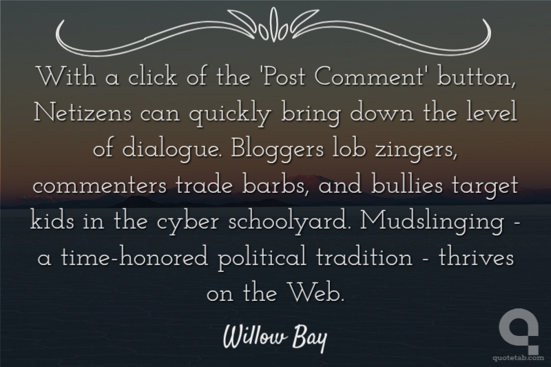 With a click of the 'Post Comment' button, Netizens can quickly bring down the level of dialogue. Bloggers lob zingers, commenters trade barbs, and bullies target kids in the cyber schoolyard. Mudslinging - a time-honored political tradition - thrives on the Web. Willow Bay