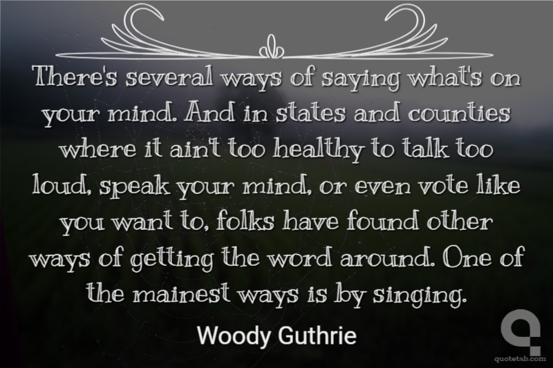 There's several ways of saying what's on your mind. And in states and counties where it ain't too healthy to talk too loud, speak your mind, or even vote like you want to, folks have found other ways of getting the word around. One of the mainest ways is by singing. Woody Guthrie