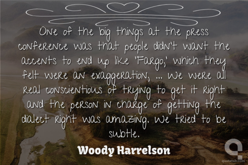 One of the big things at the press conference was that people didn't want the accents to end up like 'Fargo,' which they felt were an exaggeration, ... We were all real conscientious of trying to get it right and the person in charge of getting the dialect right was amazing. We tried to be subtle. Woody Harrelson